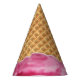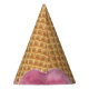 Birthday party hat featuring an upside-down ice cream cone, dripping strawberry ice cream on the hat-wearer.