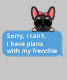 This funny frenchie sweatshirt features a cute black and tan female french bulldog with a text message that reads "Sorry, I can’t, I have plans with my frenchie.” This cute sweatshirt is also available with different coloured french bulldogs in both male and female designs.