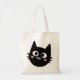 Funny tote featuring a comical cartoon black cat with big round eyes and rosy pink cheeks in a doodle drawing art style.