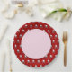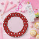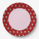 Decorate your party with these paper plates with this cute and scary cartoon of a Jolly Kitty Pirate Skull and Bones. The background is pink and red.