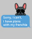 This funny frenchie sweatshirt features a cute blue french bulldog with a text message that reads "Sorry, I can’t, I have plans with my frenchie.” This cute sweatshirt is also available with different coloured french bulldogs in both male and female designs.
