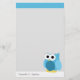 Custom stationery sheets with a cute blue owl and personalised with your name or text at the bottom.