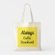 One of two of our budget friendly book tote bags. Fun phrase, "Always fully booked" is set up in a template so you can easily personalize it to your own words if you choose. Whatever words you type in will automatically appear on both front and back. Pretty yellow background on 100% machine washable cotton. We also have this design set up as saying "Forever fully booked". With an easy click, this book carrying bag design can be transferred to other sizes and shapes of tote bags.