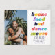 These save the date postcards are for the fun-loving couple who can't wait to announce their wedding date to their family and friends. Rainbow text "Booze, food and bad dance moves" design with your photo and wedding details. .