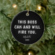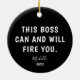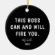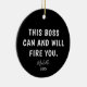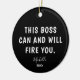 Show your boss some humour with this Funny Boss Personalised Year Christmas Ceramic Ornament. It is designed on both sides with a funny saying, "this boss can and will fire you" in bold white lettering on black background followed by name in trendy hand lettered script and custom year. Perfect boss gift idea for any occasion.