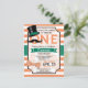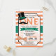 Funny retro moustache, vintage top hat, and bow tie boy's first, 1st, birthday party invite on orange and white stripes pattern. Features green, orange, and white colours. Personalised for your child's, kid's, toddler's, infant's, baby's name. First birthday invitation for boy.