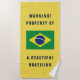 Funny Brazilian flag of Brazil personalised beach towel. Unique Birthday party gift ideas for men, women and kids. White or custom background colour. Large size for beach or pool party. Create your own extra large towels for best friends, retiree, retired person, pensioner, family, husband, wife, co worker, colleague, fun boss, employee, mum, dad, sister, brother, aunt, uncle, grandpa, grandma, manager, teacher, nurse, coach, teammate, office worker, swimmer, traveller, son , daughter, teenager, vacationer, wedding couple, newly weds, newlyweds, bride and groom, mr and mrs, honeymooners etc. Modern typography template. Personalise with his or her name at the bottom. Patriotic humour design with green and yellow country colours. Warning sign with humourous quote for Brasilian from Brasil.