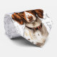 Woof art in soft faded grey on white sets off a very cute Brittany Spaniel dog in a red Santa hat for the dog lover's holiday celebrations.