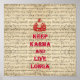 Funny humourous take on the popular "keep calm" slogan with a Buddhist theme. "Keep Karma and Live Longa" red text on an antique vintage Buddha book illustration on a vintage paper background.