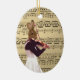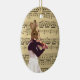 Funny bunny rabbit character in a dress wearing a dress playing a violin on a vintage music sheet background.