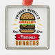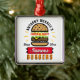 Celebrate the love of burgers and customise this funny Christmas ornament with a modern graphic of a burger with flames in red, orange, yellow, brown and black with colourful modern typography in bold fonts on a white background. Personalise it with your name with the words "fresh and tasty" and "famous burgers" which can be customised to words of your choice. Designed by © Tim Coffey.