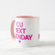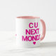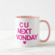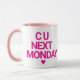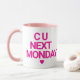 Bold Pink Text on White & Pink Coffee Cup.Start your mornings with a smirk using this cheeky “C U Next Monday” mug, designed with bold pink block lettering on a clean white mug with matching pink handle and interior. This sassy and edgy design is perfect for those who appreciate humour with a bit of attitude. Great as a gag gift, office coffee cup, or personal pick-me-up, this mug adds a bold statement to any caffeine ritual. Not for the faint of heart—this one’s for the bold and unapologetically witty.