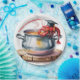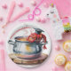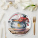 A whimsical watercolor illustration of red crawfish wearing black graduation caps emerging from a steaming silver cooking pot. The crawfish are rendered in bright red with detailed claws and antennae, each wearing a small black graduation cap with tassels. The pot sits on a wooden stump with visible rings and a warm brown color. Steam rises from the pot in wispy gray clouds. The pot has two handles on either side and sits on a light wooden surface. The illustration has a soft, painterly quality with visible brush strokes, particularly in the water and steam. The background is minimal, focusing attention on the main elements of the crawfish and pot. The crawfish are arranged in a curved pattern around the pot's rim, with their claws raised and antennae swaying in the steam.