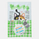 This cat kitchen towel has a cute calico cat illustration as a great funny gift for someone’s wall if they love calico cats. This is the recipe for a cats purrfect breakfast. Featuring a calico cat with a green gingham table cloth. A cute and funny illustration.