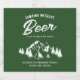 Humourous camping bachelorette beer bottle labels featuring a drawing of a campsite featuring mountains, trees, a log fire, a tent, the funny saying "camping without beer, is just sitting in the woods", and a editable text template.