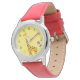 Cute watch with a funny giraffe nibbling on a purple flower and holding some flowers with its tail while roller skating on yellow background. This cute giraffe watch will make great gift for a girl or someone who loves giraffes and cute illustrations.