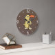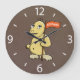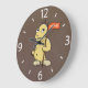 Customisable funny clock with a smiling cookie monster holding a cookie and a red flag with the text "Cookies" on dark brown textured background.