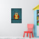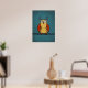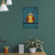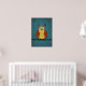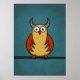 Owl poster with a funny cartoon owl with horns and big eyes on textured petroleum blue background. It stares, and stares, and stares… at you.