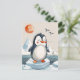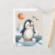 Cartoon penguin standing on an ice floe, surrounded by a serene, icy ocean landscape.