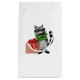 A fun design featuring a whimsical cartoon racoon with a wreath around his neck, beside a Christmas present.