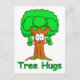 Ideal for tree lovers. Cute funny cartoon tree with green leaves, a brown trunk, a happy smile and big round eyes. Under the tree are the words "Tree Hugs" in green text.