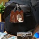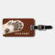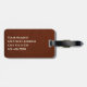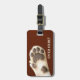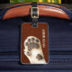 Luggage tag featuring a funny image of a cat paw on a faux leather background.