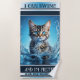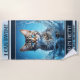 Beach towel featuring a cute kitty in water, bravely swimming. The background is a navy blue striped design. Great for the pool side or beach.