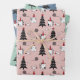 Funny Christmas illustration of cats in Santa hats with little mice, fish and yarn around Christmas trees. All-over print pattern on pink, green and blue backgrounds.