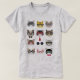 Several different kind of cute and funny cats with glasses which are with black, red, pink and teal frames. Some of them have bow ties in black and red and red tie. The background has very light grey geometric pattern in very light beige. The back of T shirts has an image of a black tie and sunglasses. This is a digital illustration.
