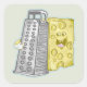 A funny cartoon illustration of a cheese grater and I block of cheese. The block of cheese is rubbing up against the grater to get a massage.