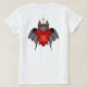 Comical Goth vampire bat holding a big red heart and wearing a yellow star headband cartoon art on a cute, and fashionable white top for women and teens. "Batty Christmas" is written in the front. On the back, the wording reads "And a Batty New Year!".