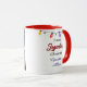 A funny Sasquatch personalized Christmas coffee mug with a comic book style pop art sasquatch smiling with a Santa and Christmas lights on.