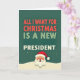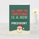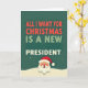 This hilarious holiday greeting card features a playful, political twist on a classic Christmas song. The text on the card reads: "ALL I WANT FOR CHRISTMAS IS A NEW PRESIDENT." Below the text, a cheerful Santa Claus with a big white beard peeks over a snowy hill. The card's design uses bold, retro-style lettering in red and green against a dark teal background. It is perfect for sending a laugh to friends, family, or colleagues who enjoy political humour and have a strong opinion about the upcoming election. This design is ideal for sharing some cheer and a chuckle during the Christmas season.🎄🎁!