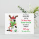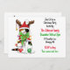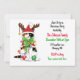 A not amused calico cat with antlers, Santa hat, green bow, ornaments and Christmas lights on a Christmas party invite.