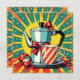 A funny unique Christmas card that has a comic book pop art style coffee pot and cup. A hilarious message on the back about coffee, Christmas and panicking that you can personalize if wanted.