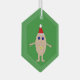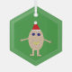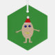 This ornament features a funny cartoon of an egg with arms and legs. The egg has arms and legs and a small crack in its head exposing the white inside. It has blue eyes with a black pupil and a big smile where the yolk of the egg can be seen. The eggshell looks rough. This Christmas egg is wearing a santa hat ready to party this holiday season.