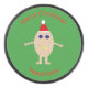 This awesome hockey puck features a funny cartoon of an egg with arms and legs. The egg has arms and legs and a small crack in its head exposing the white inside. It has blue eyes with a black pupil and a big smile where the yolk of the egg can be seen. The eggshell looks rough. This Christmas egg is wearing a santa hat ready to party this holiday season.