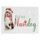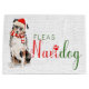A tricolor Australian Shepherd sits with a cute red Santa hat and a red and white striped scarf is ready to wish Fleas Navidog to any dog lover or pet lover who adores the Aussie breed.