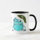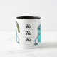A funny wide mouth frog in shades of blue. He wears a green and white santa hat. Message says 'ho, ho, ho...' this can be changed if so desired.