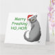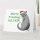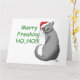 A grey cat wearing a red Santa hat. The grey cat is grumpy about Christmas