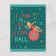 I came in like a festive ball. This silly Christmas design shows a woman with a drink in her hand riding on a Christmas tree ornament. She's surrounded by snowflakes and music notes.