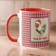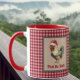 This funny rooster wants to cheer you up for your morning coffee during the holidays or any day, especially if you're feeling peckish. He's wearing a Santa hat and encouraging you to "Peck the Halls" - but you can edit the text if you want as long it's short. The rooster has an antique look, with dusty teal blue feathers, and is set against a tan and white faux dotted Swiss and framed in teal. The mug background is a cheery gingham-like farmhouse chic plaid. Be forwarned that Santa might be chicken his list twice :-).