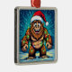 A funny Bigfoot Christmas metal ornament with a comic book style pop art sasquatch smiling with a Santa and Christmas lights on.