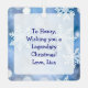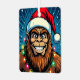 A funny Bigfoot Christmas metal ornament with a comic book style pop art sasquatch smiling with a Santa and Christmas lights on. You can personalized a message on the back.