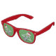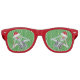 These retro party glasses have a funny Christmas skeleton wearing a red Santa Hat holding up round ornaments to each eye on a green background.