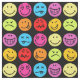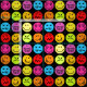 Funny colorful faces pattern design. Some are happy, silly, angry, winking, joyful, funny, in love, pouting, tongue out, and more fun emotions in colorful bright colors; yellow, orange, red, blue, red, pink, and purple, on a black background.