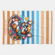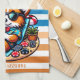 Create a unique personalised kitchen towel in vintage style with a funny illustration of a corgi playing poker on a beach. Use the template to type you family name or other text.