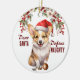 On the front of this Holiday ornament is the image of a cute Corgi puppy wearing a red and white Santa Claus hat. He sits with a broken tree ornament in front of him. The red text says "Dear SANTA Define NAUGHTY". On the back, red and green text says MERRY CHRISTMAS", and there are additional text fields for you to customise to whatever you'd like.