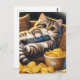 AI generated art of a funny couch potato cat holding the remote and a spilled bowl of potato chips next to it