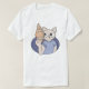 A playful cartoon cat, wearing a blue t-shirt, displays a croissant with sharp outlines and soft pastel tones. A quirky and friendly vibe for children and lovers of pets and croissants.